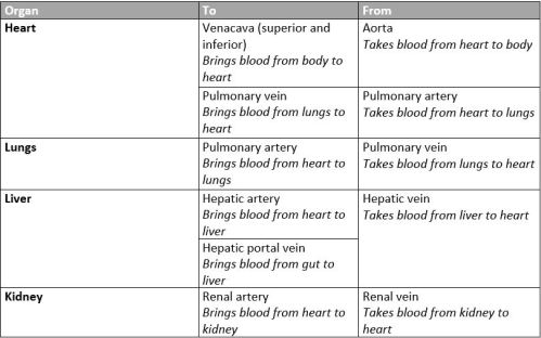 - Name the main blood vessels to and from the heart, lungs, liver and kidney.